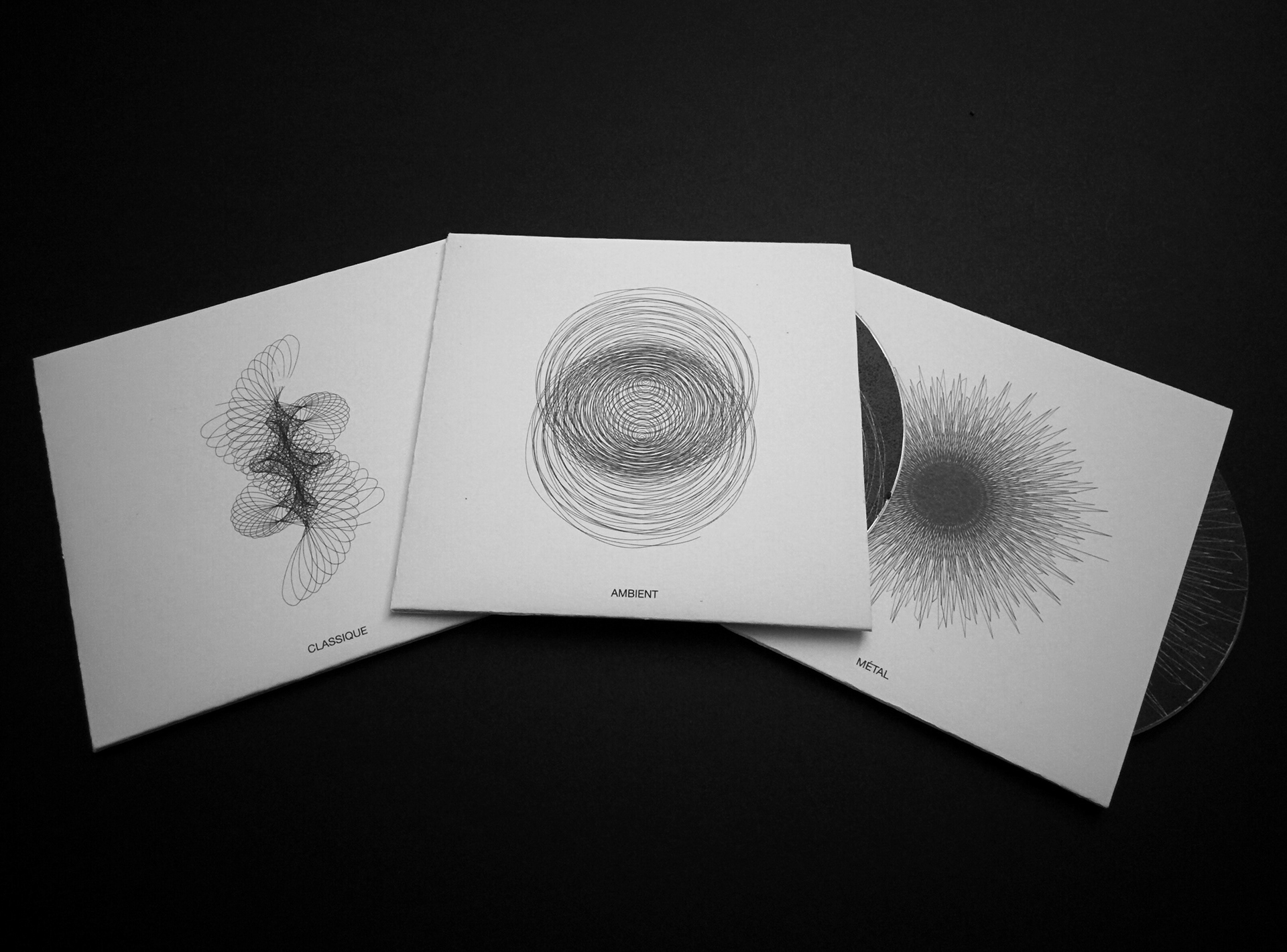 Conception de trois pochettes d'album en utilisant la notion de la ligne appliquée à trois genres musicaux : ambient, métal et classique.